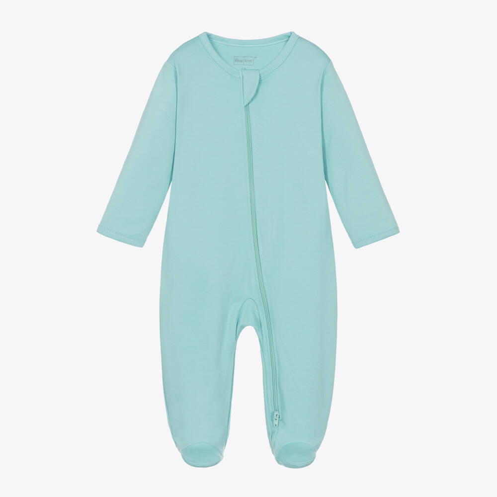 A blue babygrow for boys and girls from Kissy Love. It is made from Pima cotton, a beautifully soft fabric prized for its gentle feel on baby's skin. With a chin guard, the two-way zip fastening runs from the top to the foot, making this an ideal choice for quick dressing. Smaller sizes have fold-over scratch mittens on the long sleeves to protect their tiny hands.