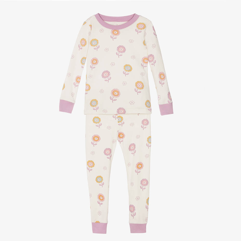 Ivory pyjamas for little girls by Kissy Love, made in the softest Pima cotton jersey. Pretty for bedtime snuggles, these pyjamas are patterned in a pink and lilac purple blossom flower design. The long-sleeved crew neck top and elasticated trousers are finished with cuffed hems for comfort.