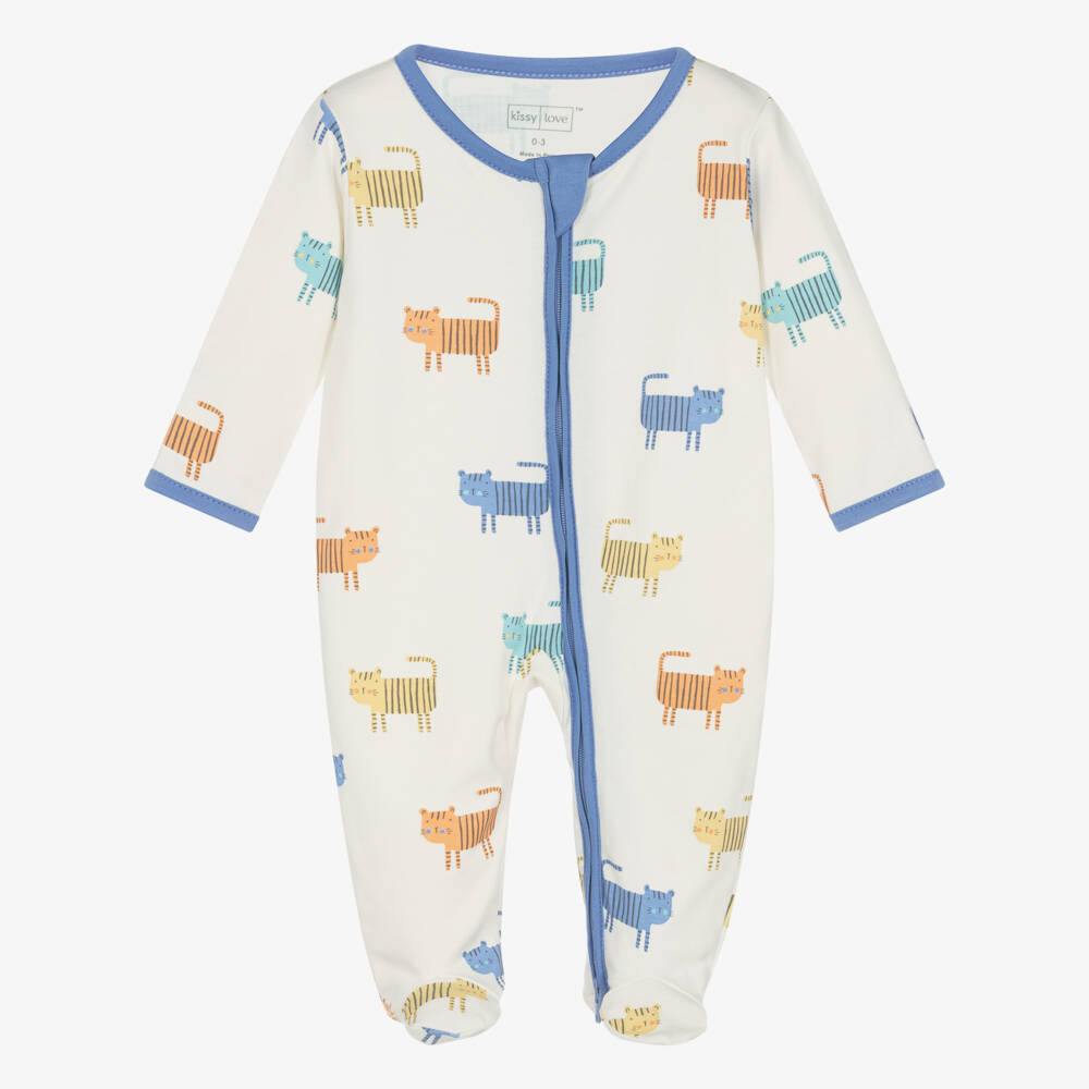 A babygrow for boys and girls from Kissy Love, in ivory with blue, yellow and orange tiger illustrations. It is made from Pima cotton, a lovely fabric renowned for its soft-on-the-skin feel. With a chin guard, the two-way zip fastening runs from the top to the foot, making this an ideal choice for super-simple dressing. Smaller sizes have fold-over scratch mittens on the long sleeves to protect the smallest of hands.