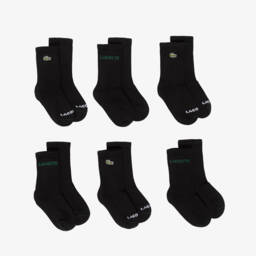 Six pairs of black socks by Lacoste, offering boys and girls a comfortable and stylish choice for everyday wear. Made from a soft and stretchy cotton blend, they are ribbed for a snug fit. Three pairs feature the signature crocodile logo, and three pairs are finished with an intarsia logo at the top.