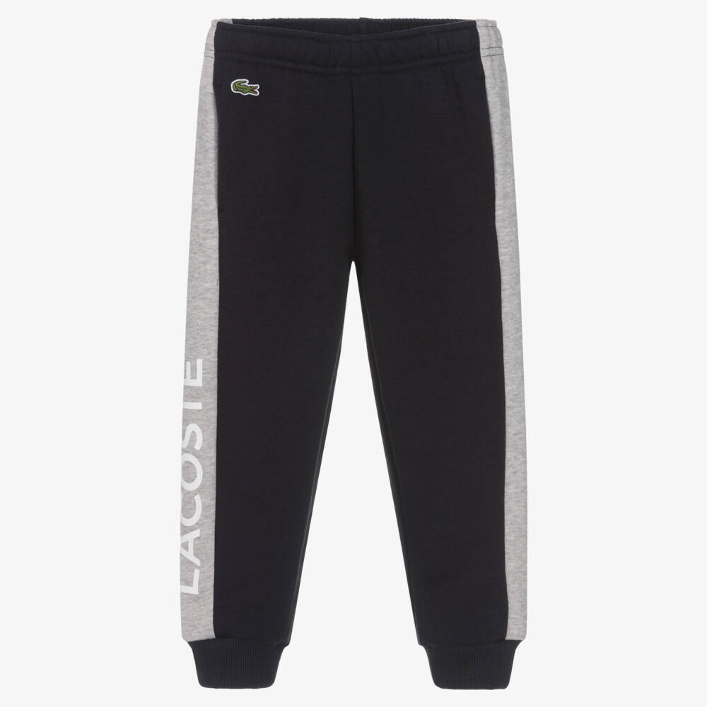 Navy blue and grey joggers for boys and girls by Lacoste, made in an organic cotton blend. Comfortable to wear with a super soft fleecy inside, they have concealed front pockets and a raised white logo print down one leg. For a good fit, they have an elasticated waistband and an inside drawstring with logo end caps. The brand's iconic green crocodile logo is on the front for an extra designer finish.