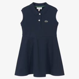 A navy blue sleeveless dress for girls by Lacoste, in a stylish polo design with a ribbed collar and branded button fastenings on the front. Made in the brand's signature cotton petit piqué for breathability, this sporty style has a fit and flare silhouette. For a designer finishing touch, the instantly recognisable crocodile patch can be seen on the chest.