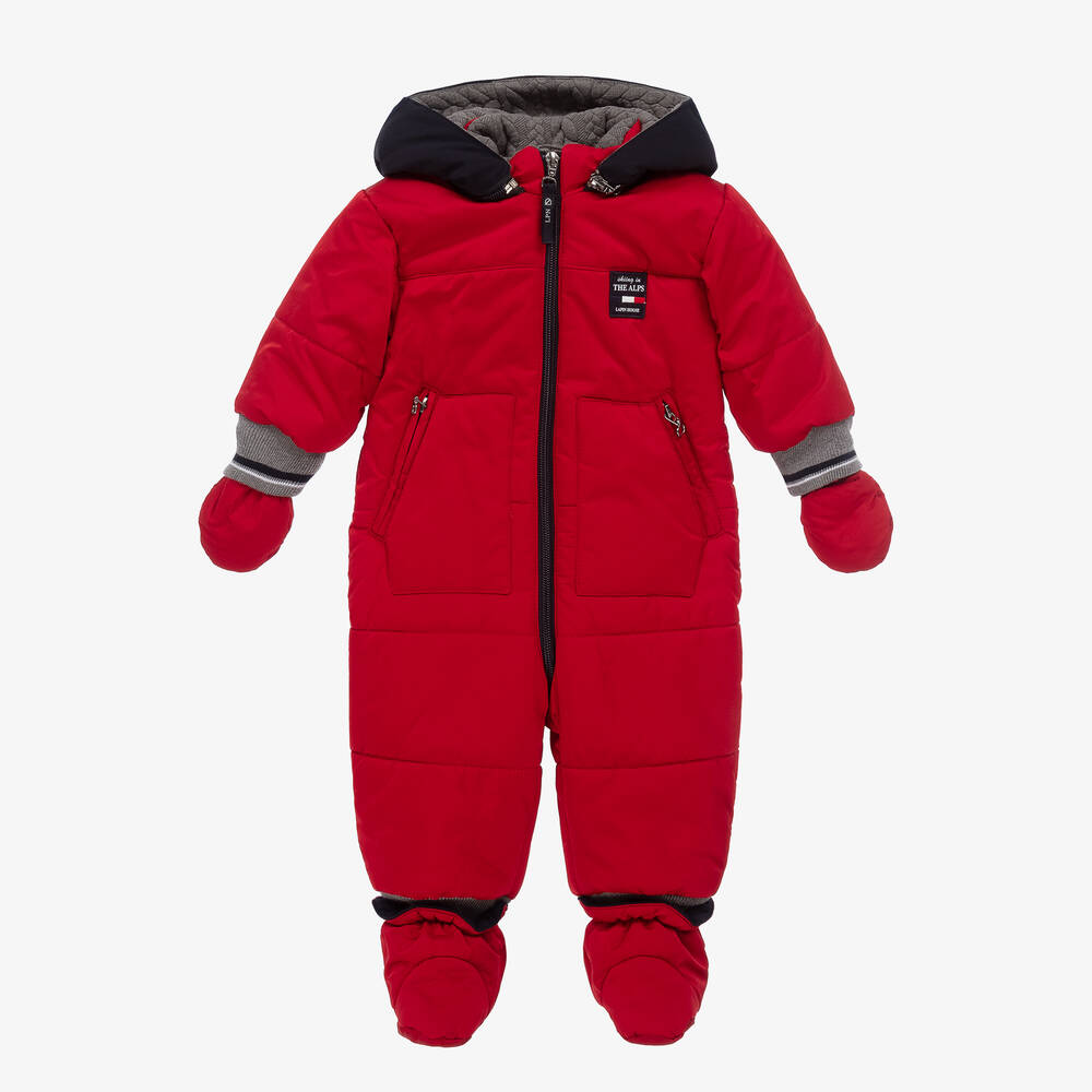 Red snowsuit for baby boys by Lapin House, made in soft, smooth fabric. Warmly padded, it is lined in a soft cotton blend. The navy blue hood is removable and has a knitted trim around top with a white knitted logo and is lined in soft jersey, with a lovely cable knit pattern. This cosy snowsuit has grey, navy blue and white ribbed cuffs and detachable, jersey-lined mittens and booties. It fastens with a zip on the front and has front patch and zip-fastening pockets and a navy blue appliqué logo patch on the chest.