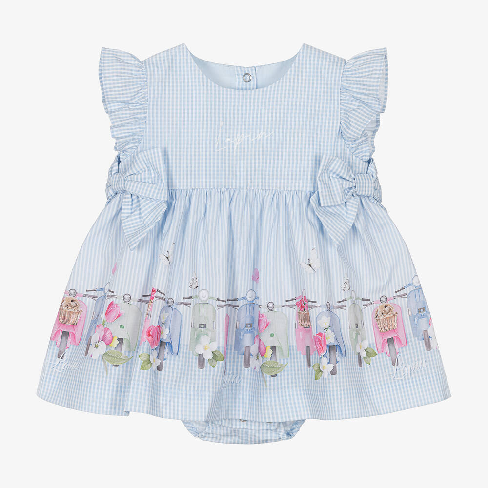 In blue and white stripes and gingham checks, this lovely cotton poplin dress for baby girls is by Lapin House. It has a cute print of colourful scooters, flowers and bunny with subtle logos around the hem. There are ruffles on the shoulders and pretty bows on each side. Easy and practical, the dress comes with attached knickers and fastens with poppers down the back and between the elasticated legs.