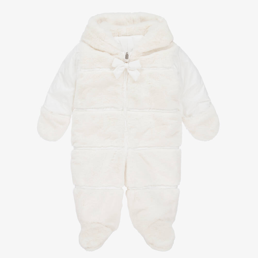 Adorable ivory reversible snowsuit for baby girls by Lapin House. One side is made in super soft and cosy plush faux fur, with silky smooth trims, while the reverse is silky smooth. Ideal for those colder days, it is warmly padded with a large fluffy hood and has fold-over mittens to help keep little hands warm. The easy-to-use front zip has a pretty attached bow for a sweet finish.