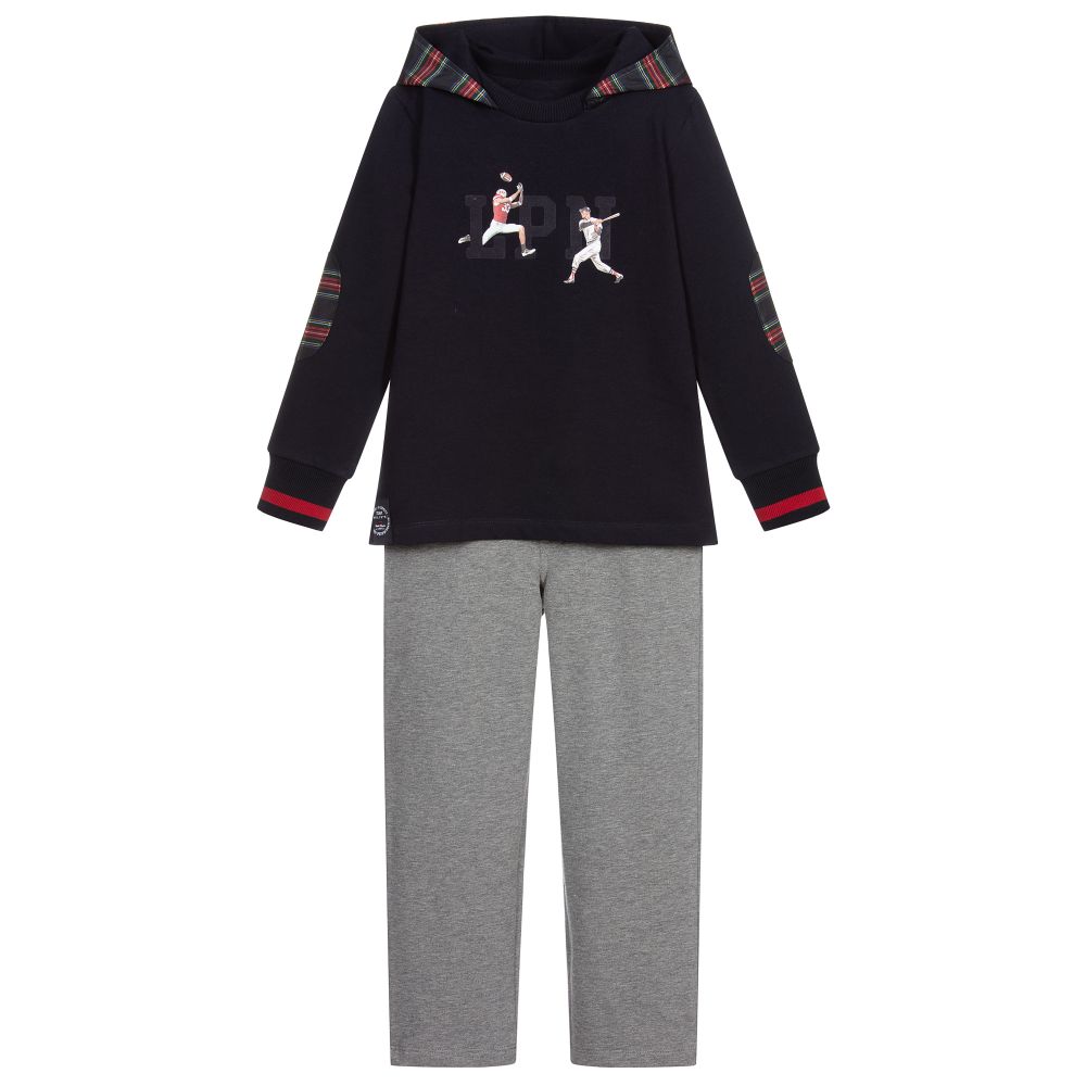 Boys grey and navy blue tracksuit from Lapin House, made in mid-weight cotton jersey, with a brushed feel inside. The hoodie top has a nylon hood lined in jersey and blue, red and green tartan trim. It has a sports themed print, with velvet-feel text on the chest. The grey joggers have an elasticated waistband.