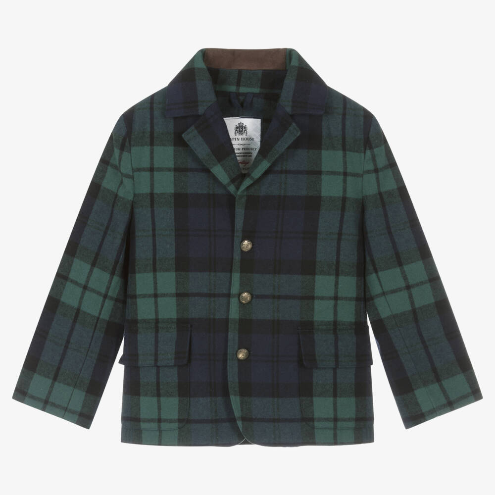 In a smart tartan design, this blue and green cotton blazer for boys is by Lapin House. It has a single-breasted lapel, neatly fastening beneath with gold crest buttons for a sophisticated look. Patches are sewn onto the elbows and collar in a brown shade, and there are pockets on the front. A soft cotton lining finishes this jacket.