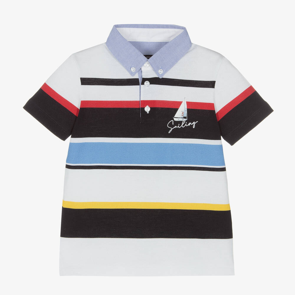 Nautical polo shirt for boys by Lapin House, made in comfortable cotton piqué. Striped in blue, white, red and yellow, it has a sailing boat print on the front and a button-down collar in blue Oxford cotton for a smart-casual look.