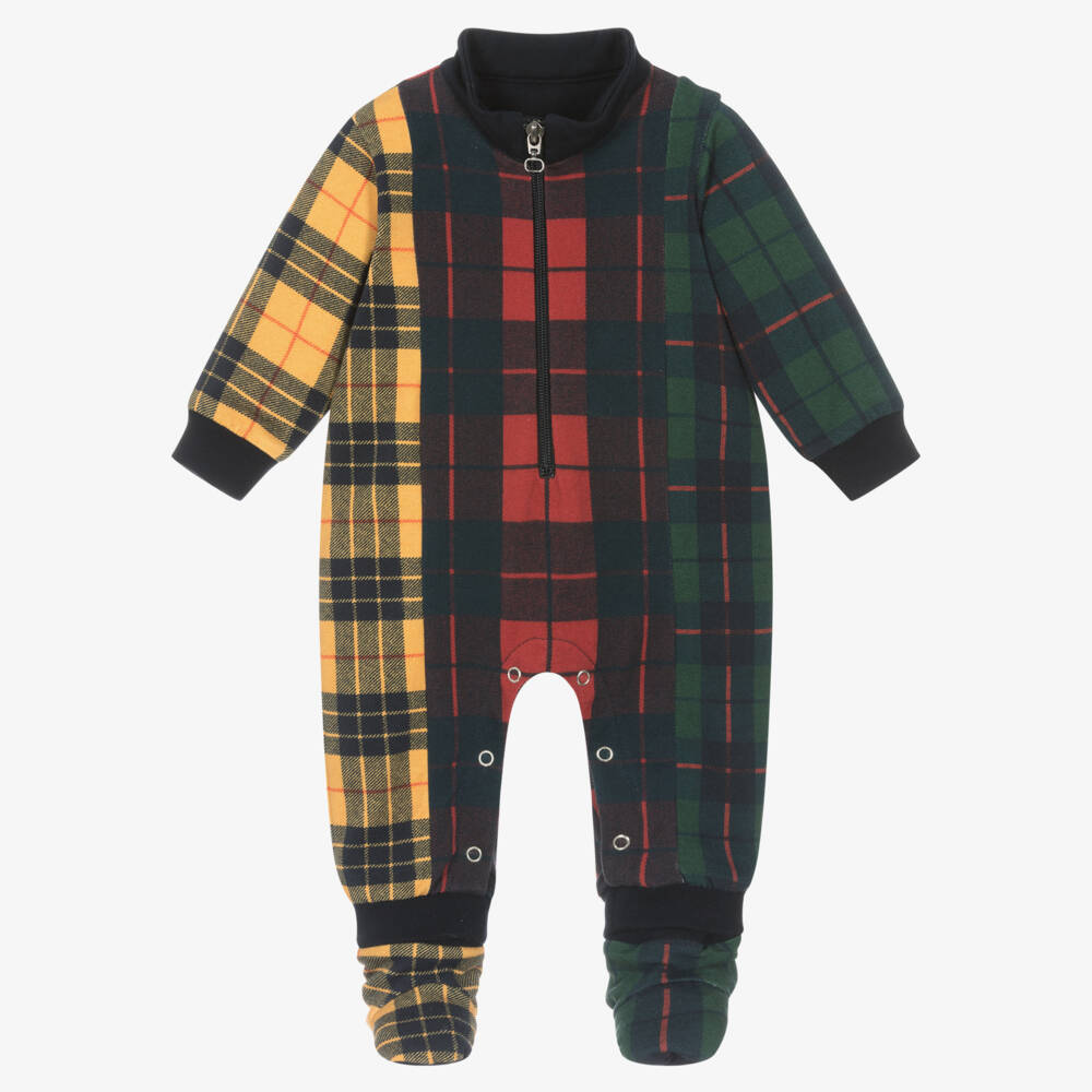 A sweet navy blue tartan cotton babysuit for boys from Lapin House, with detachable booties. Made in soft and mid-weight jersey with a cosy brushed feel inside, it is patterned in different coloured checks, in shades of yellow, red and green. It fastens easily at the front with a zip fastener and has poppers between the legs for quick and easy changing. The booties attach with buttons. Ideal as a gift, it is beautifully presented in a suitcase-style gift box.