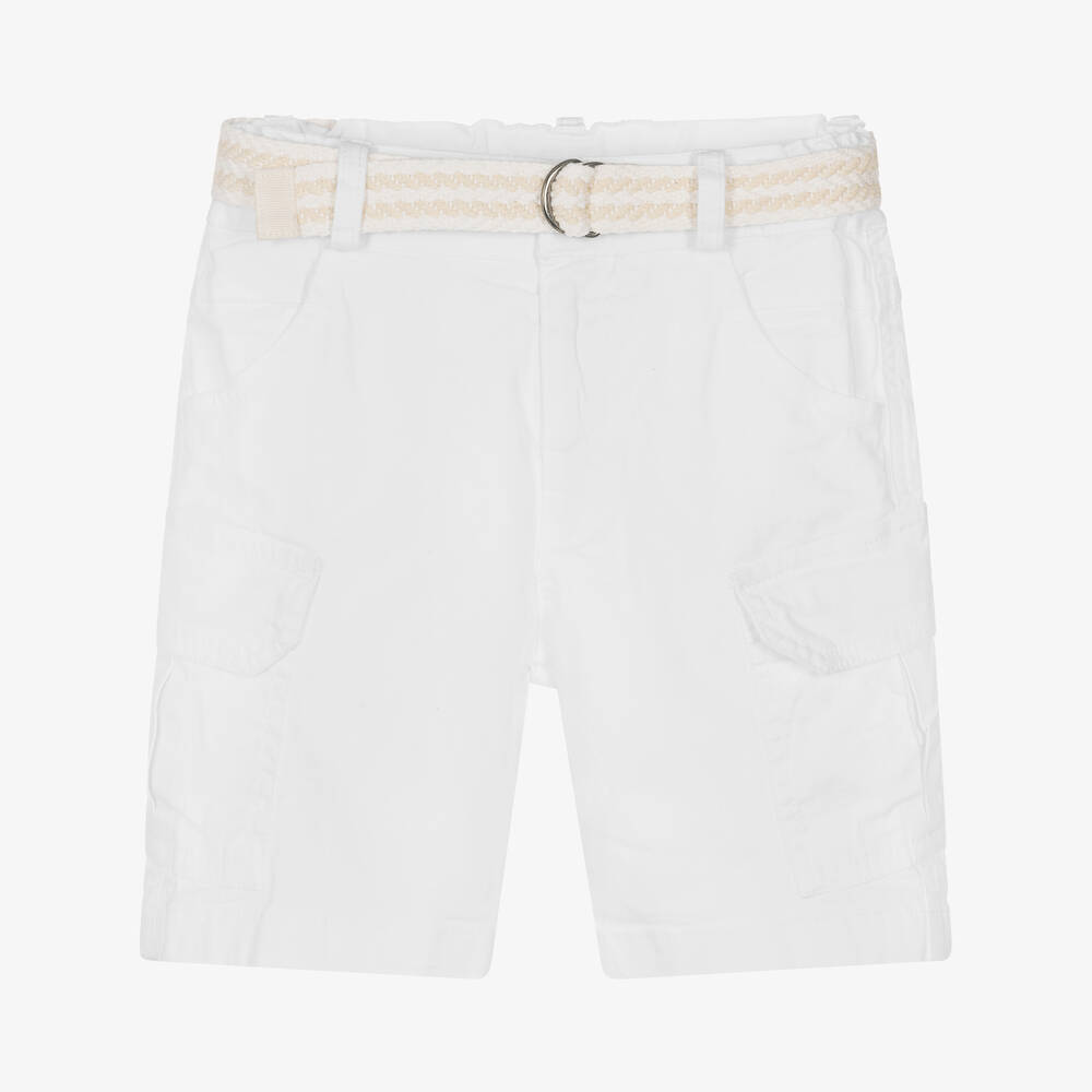 Casual white cotton cargo shorts for boys by Lapin House, just right for relaxed days. Made in lightweight twill with a slight stretch, they have useful jetted front pockets and cargo pockets on the legs. They have a detachable, woven, webbed belt in ivory and beige and an adjustable waist for a good fit. There is a logo button fastening on the front and a zip.