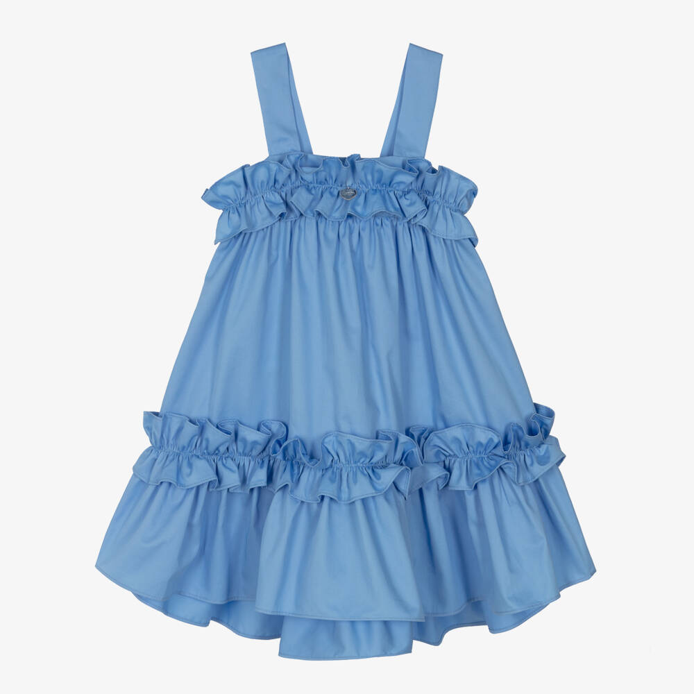 Pretty cotton sateen dress for girls by Lapin House, in a beautiful cornflower blue. Ideal for warm, sunny days, it is cool and lightweight, with a central silver heart logo charm on the ruffle around the bodice. The skirt has a ruffle around it too, and is slightly shorter on the front than the back. The dress fastens on one side with a discreet, concealed zip.
