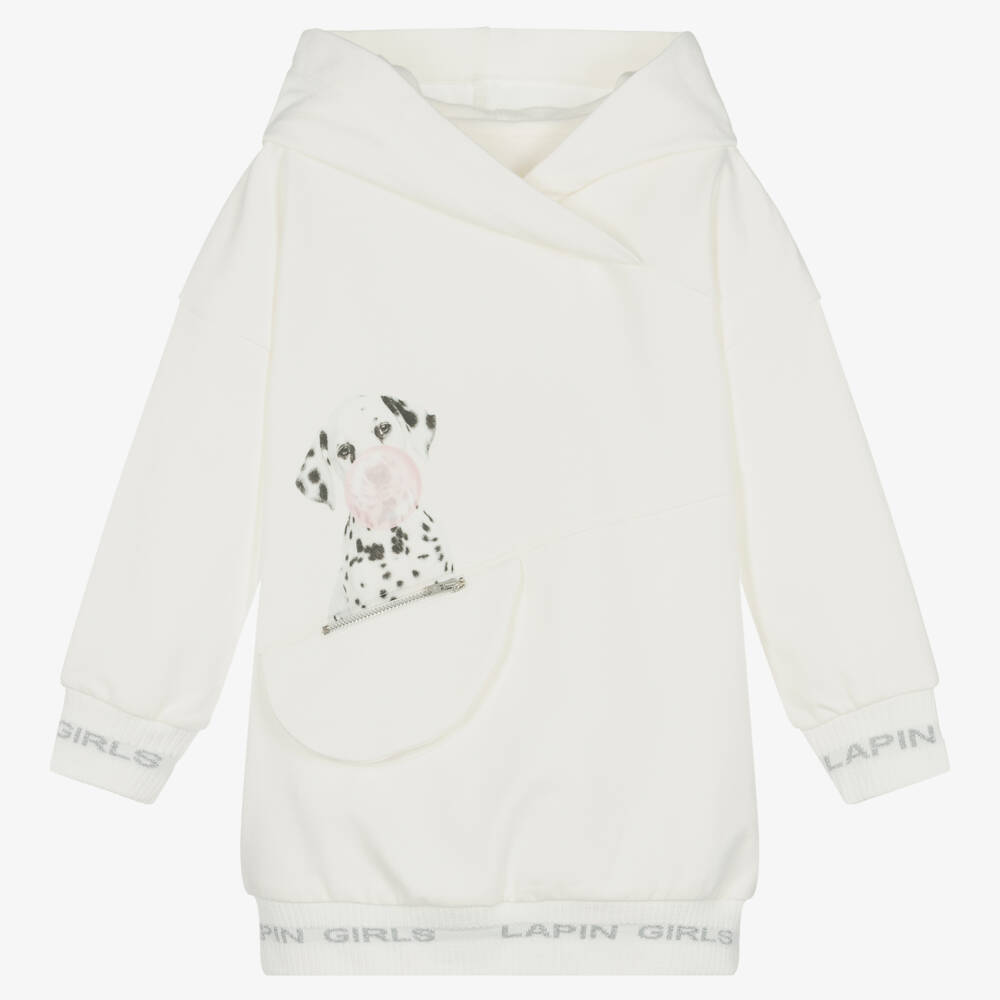 Ivory hooded sweatshirt dress for girls by Lapin House, made in soft and stretchy cotton jersey. Warm and cosy, with a fleecy inside, it has ribbed trims with glittery silver 'Lapin Girls' logos. There is a cute dalmation printed on the front blowing a pink bubblegum bubble and a zip fastening pocket below, designed to look like a bag.