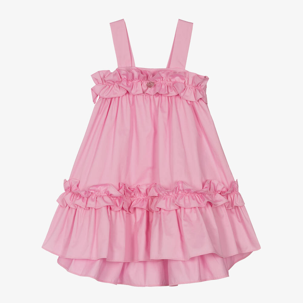 A lovely lilac pink dress for girls by Lapin House, made from soft cotton poplin. Ideal for the warmer weather, this sleeveless design has a ruffled trim on the bodice and an identical trim on the full skirt for added texture. There is a silver, heart-shaped logo charm on the front and a concealed zip fastening on one side.