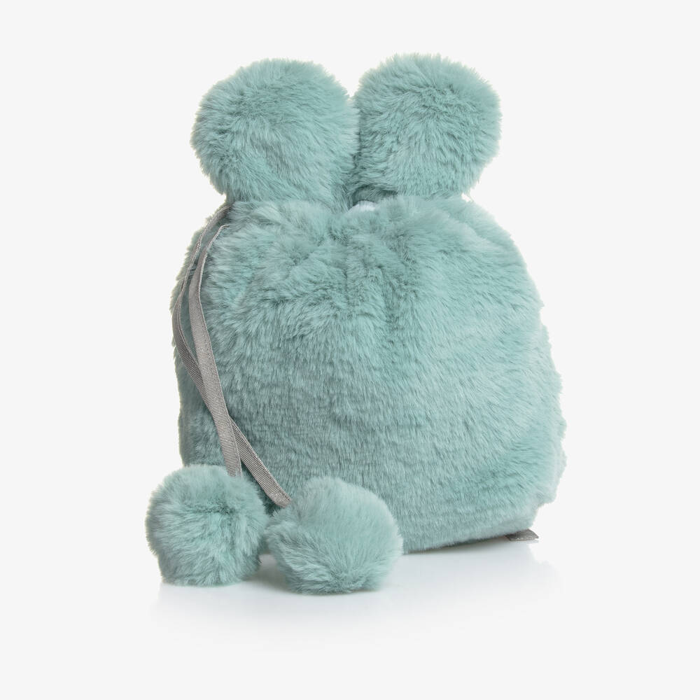 Adorable mint green backpack for girls by Lapin House, made in beautifully soft and snuggly plush faux fur. It has sweet bunny ears on top, with a pom-pom drawstring to secure the opening. The main compartment is lined in lightweight cotton and ideal for carrying small essentials. The sparkly grey shoulder straps are adjustable for a good fit.