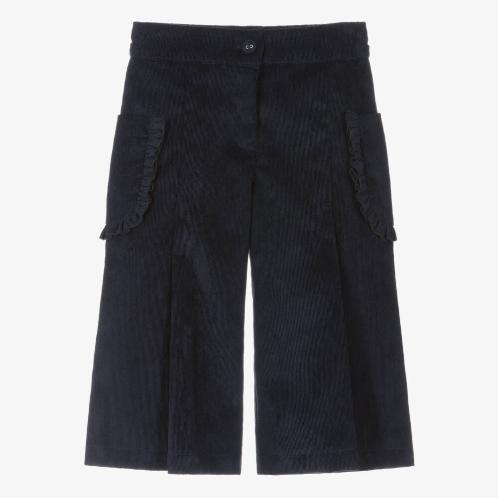 Navy blue culottes for girls by Lapin House, in a slightly cropped fit. Softly woven, these wide-leg trousers are made in mid-weight corduroy for cosiness. Featured on the sides are frill-trimmed pockets, great to store her small essentials. Darted on the front for freer movement, they fasten with a fabric-covered button and zip for a neat look. The waist is adjustable for the ideal fit.