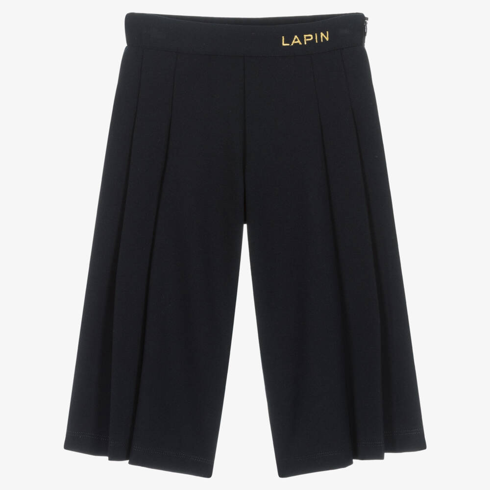 Navy blue culottes for girls by Lapin House, made in soft and stretchy Milano jersey. With pleated details, these smart trousers are gently elasticated on the back of the adjustable waist and are detailed with metallic gold logo embroidery on the front. There is a neatly concealed zip on one side making them easy to slip on and off.