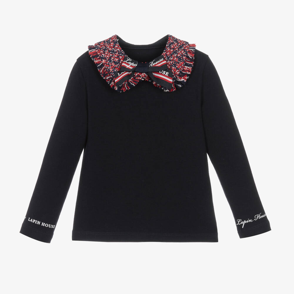A navy blue top for girls from Lapin House, made in soft and stretchy cotton jersey. It has a lovely red, blue and white tweed collar, with fringed edges and a branded, striped grosgrain bow. A popper fastening on the collar allows for ease when dressing. White glitter logo prints can be found above the cuffs to complement the design.
