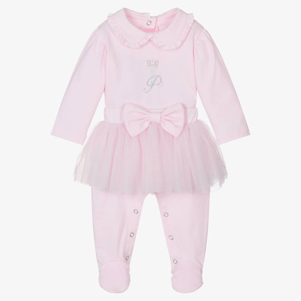 Lovely pink cotton babygrow for little girls by Lapin House. Made in soft and stretchy jersey, this gorgeous babygrow has a frilled collar and a sparkly logo motif on the front. There are popper fastenings on the back and between the legs for quick and easy changing. It comes with an adorable matching glitter tulle skirt that attaches at the waist with buttons. The skirt has a gently elasticated waistband with an attached bow and layers of tulle for added volume.