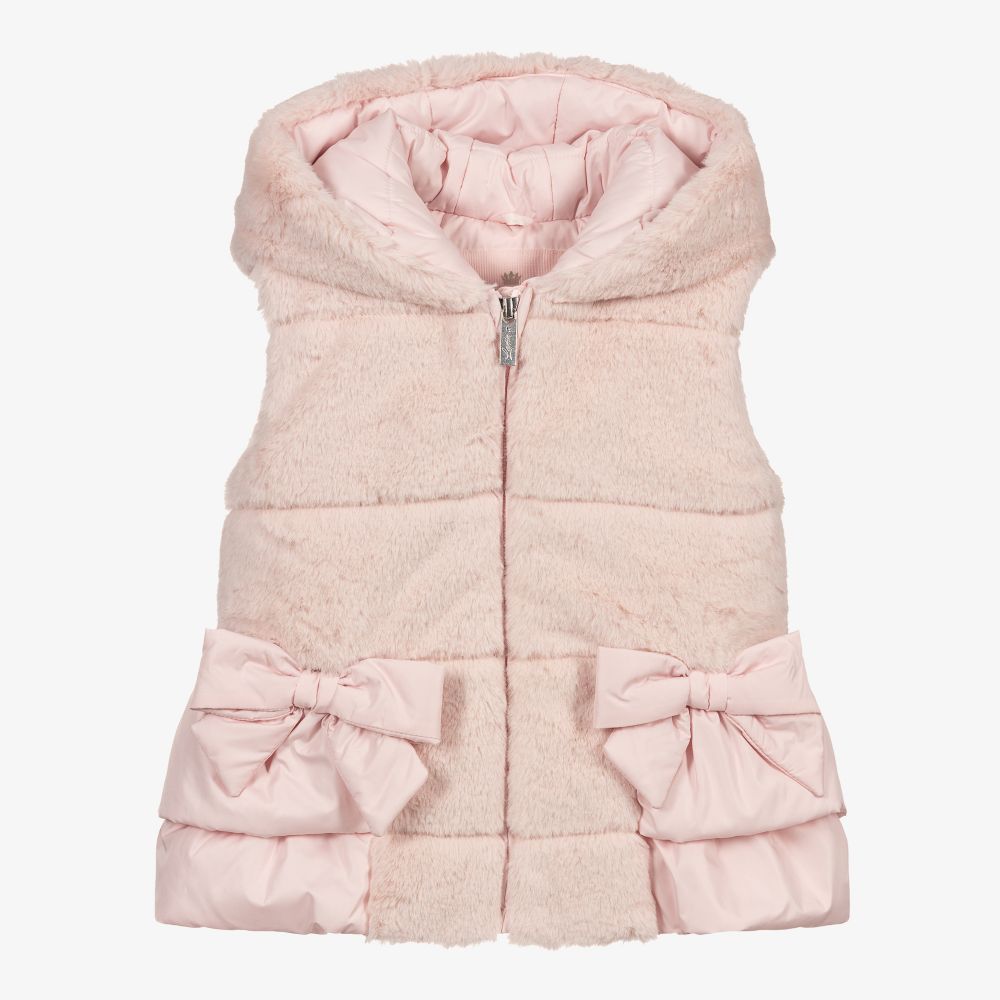 Girls pink faux fur hooded gilet from Lapin House. Warmly padded, it has silky-feel tiers and bows on the sides. There is a quilted cotton lining and a front zip fastening.