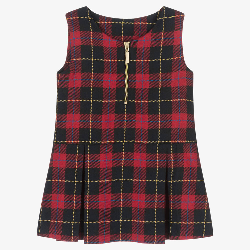 Smart red and black tartan dress for girls by Lapin House, woven in a soft wool and cotton blend with a lightweight lining for added comfort. This traditional design has a smart A-line silhouette with a dropped waist and inverted pleats on the front. Ideal for layering, it fastening with an elgant gold half-zip on the front.