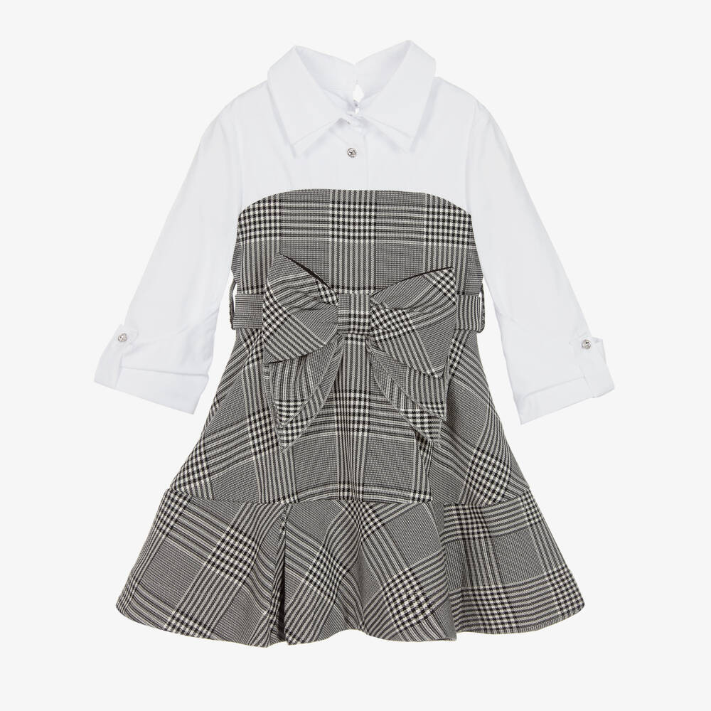 A stylish white and black shirt dress for girls by Lapin House, woven from a soft cotton and viscose blend. The poplin bodice has a double-layered collar, buttoning up at the front with a diamanté. The sleeves are rolled up and secured with a diamanté button, creating a chic yet casual look. A monochromatic check design decorates the skirt, with a removable bow belt which attaches with poppers. This dress is finished with eye-catching keyhole button fastenings, and zips-up effortlessly at the back.
