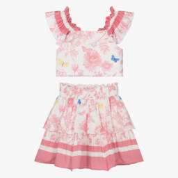 A smart white and navy blue skirt set for girls by Lapin House. The soft, stretchy jersey blouse has silver logo script embroidery on the poplin collar and sparkling diamanté centres to the cuff button fastenings. The lightweight, warm, wool twill skirt has a large, fixed velvet bow with a central silver metal logo charm on the adjustable waistband, and is patterned with flocked polka dots. For extra comfort, the shoulder straps are also adjustable and there is a lightweight cotton lining.