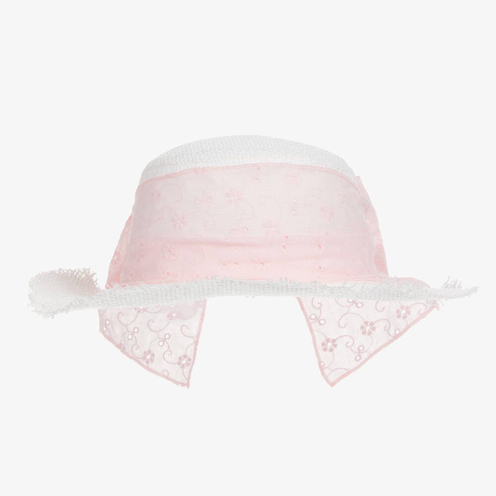 Pretty white straw hat for baby girls by Lapin House, with a pink broderie anglaise sash and bow. Great for sunny days, the brim has raw edges and shades the face.