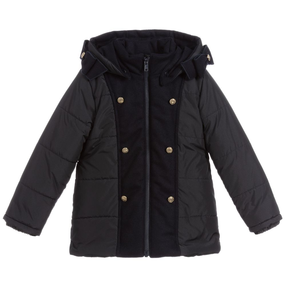Girls dark navy blue puffer coat from Lapin House, with felted wool panels on the front and a comfortable quilted lining. There are bows on the removable hood, with decorative gold embossed buttons and a front zip fastening.