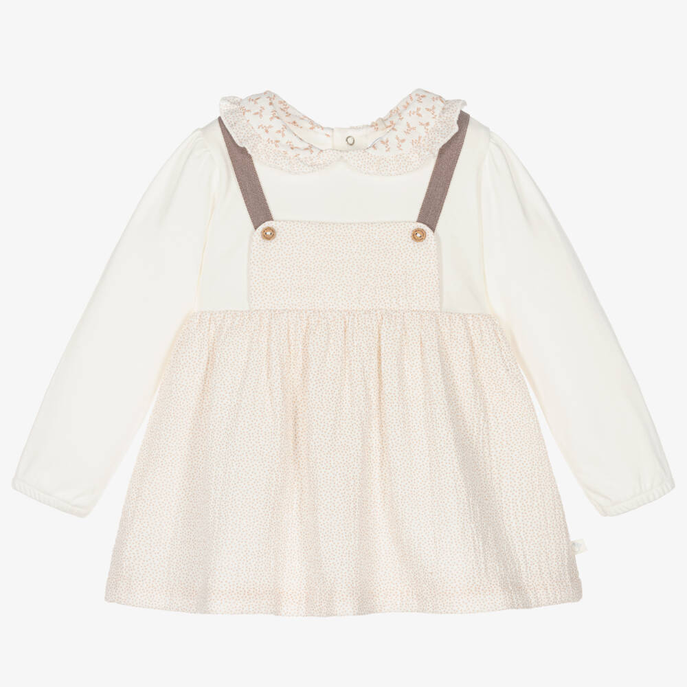 Ivory with a pink dotty pattern, this sweet pinafore style dress for baby girls is by Portuguese brand Laranjinha. The upper part is made in soft cotton jersey and the lower part is made in lightweight cheesecloth. With classic styling, the dress has a ruffle trimmed Peter Pan collar and decorative wooden buttons on the front. The sleeve cuffs are gently elasticated and there are easy fastening poppers on the back.