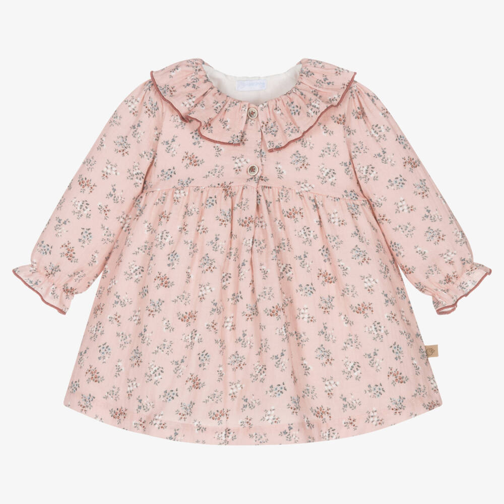 Lovely pink dress for baby girls from Laranjinha, made in a soft cotton cheesecloth. Patterned in a delightful floral print, it has a ruffle collar and gently elasticated cuffs. It is fully lined in cotton voile for comfort and fastens with buttons on the front.