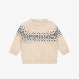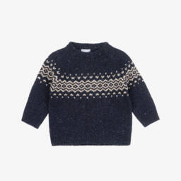 Boys navy blue flecked sweater by Laranjinha with a classic Fair Isle pattern in beige, for traditional style. Knitted in a warm wool blend with ribbed trims, this sweater is warm and comfortable, ideal for the cooler months.