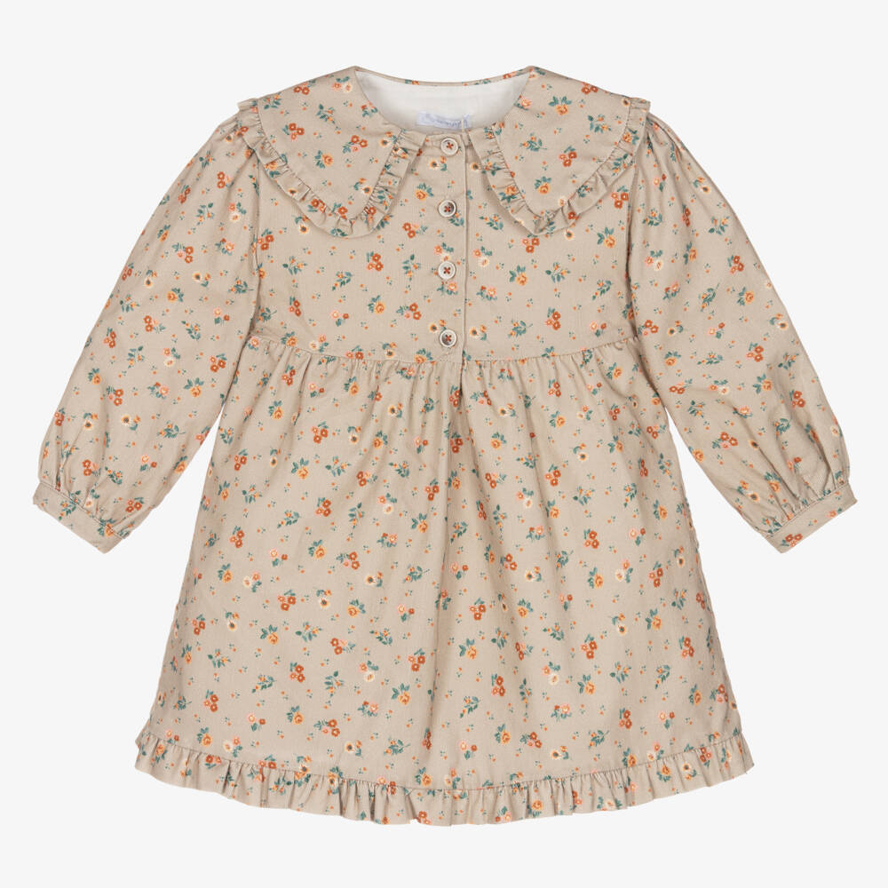 Pretty beige dress for girls by Laranjinha, with a lovely floral pattern in shades of pink, brown and green. Made in beautifully soft, cotton needlecord, this timeless style has a sweet ruffled collar and hem. It is comfortably lined in lightweight cotton and fastens with branded buttons on the front.