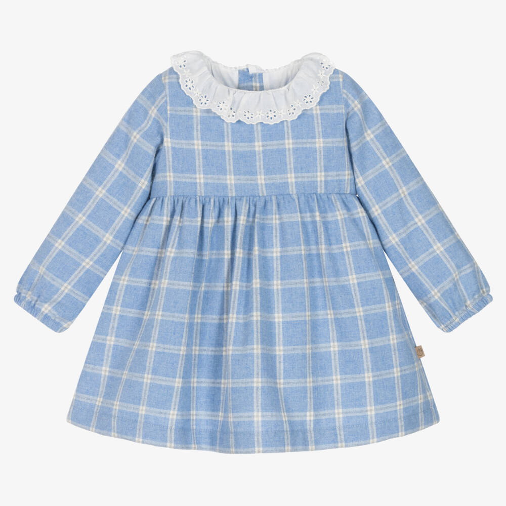 Beautifully soft, this blue brushed cotton dress for younger girls by Portuguese brand Laranjinha, has a lovely grey and white checked pattern. Designed with a pretty white broderie anglaise ruffle collar, it has gently elasticated cuffs, button fastenings on the back, and is fully lined in lightweight voile for comfort.