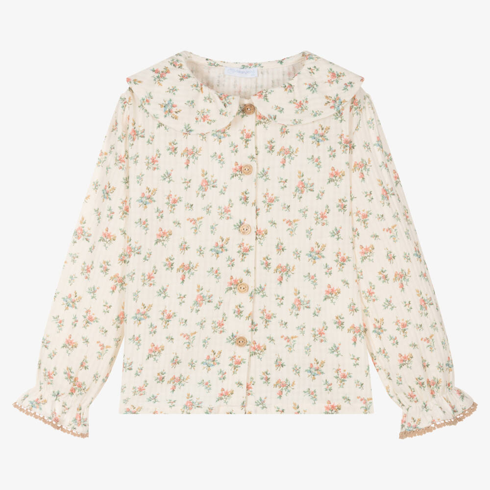 A beautiful ivory blouse for girls by Portuguese brand Laranjinha, with a pretty pink, beige and blue floral print. It has a classic Peter Pan collar and frilly elasticated cuffs, delicately trimmed with beige lace. Woven in soft and comfortable cotton, it fastens with traditional wooden buttons on the front.