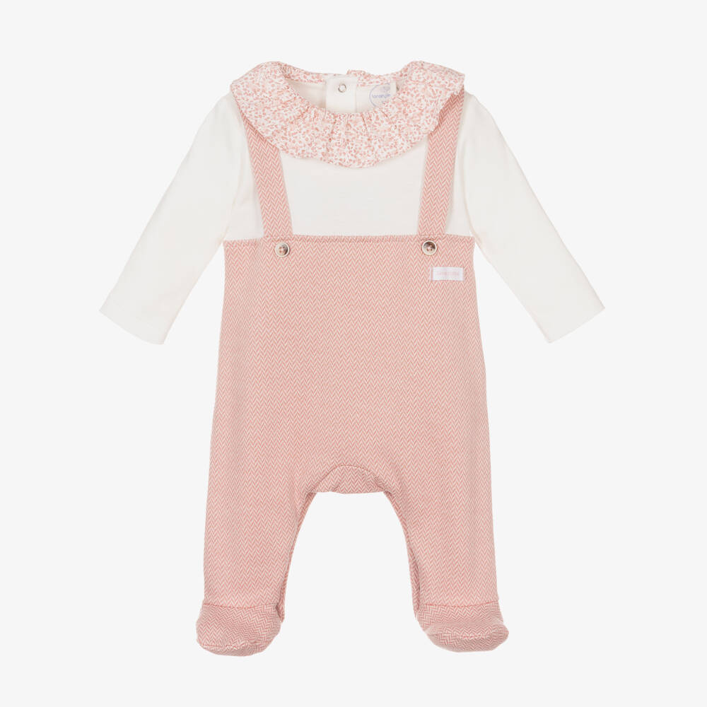 A charming white and pink babygrow for girls by Laranjinha. Resembling a top with trousers and braces, the upper part is plain, whilst the lower part has a classic herringbone pattern. This comfortable one piece is made in soft cotton jersey, with a pretty floral ruffle collar, and easy-fastening poppers on the back and between the legs.