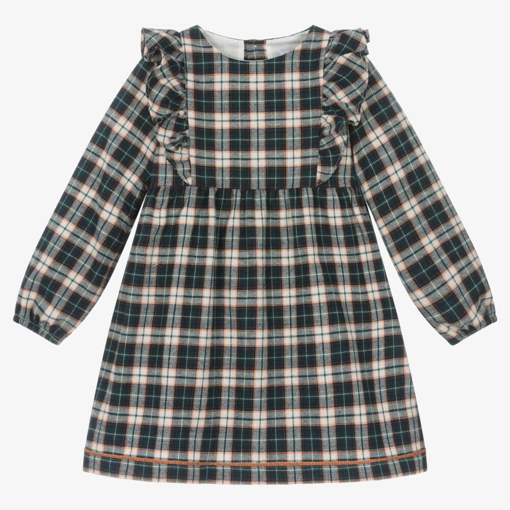 In green, blue, orange and ivory, this lovely tartan check dress for girls is by Portuguese brand Laranjinha. It is made in softly brushed cotton twill, with a gently gathered skirt and pretty ruffles on the bodice. Lined in lightweight voile for comfort, it fastens with traditional wooden buttons on the back.