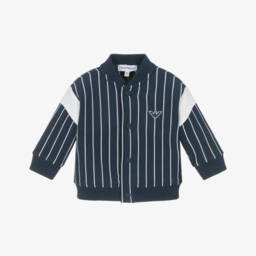 A navy blue and pale pink reversible puffer jacket for girls by Le Chic, made with smooth recycled polyester. The blue side is trimmed with a gold metal logo plate. The pink side is patterned with a repeat gold logo motif. It fastens with a front zip and both sides have pockets. It has ribbed elasticated cuffs with a metallic gold thread.