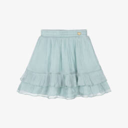 An eye-catching, beige skirt for girls by Le Chic, made in lightweight, textured chiffon with a beautiful floral print and glittery gold embroidery. This pretty skirt has a delicate ruffle hem and a comfortable elasticated waist with a gold heart logo charm and an internal drawstring. It is lined in soft voile for comfort.