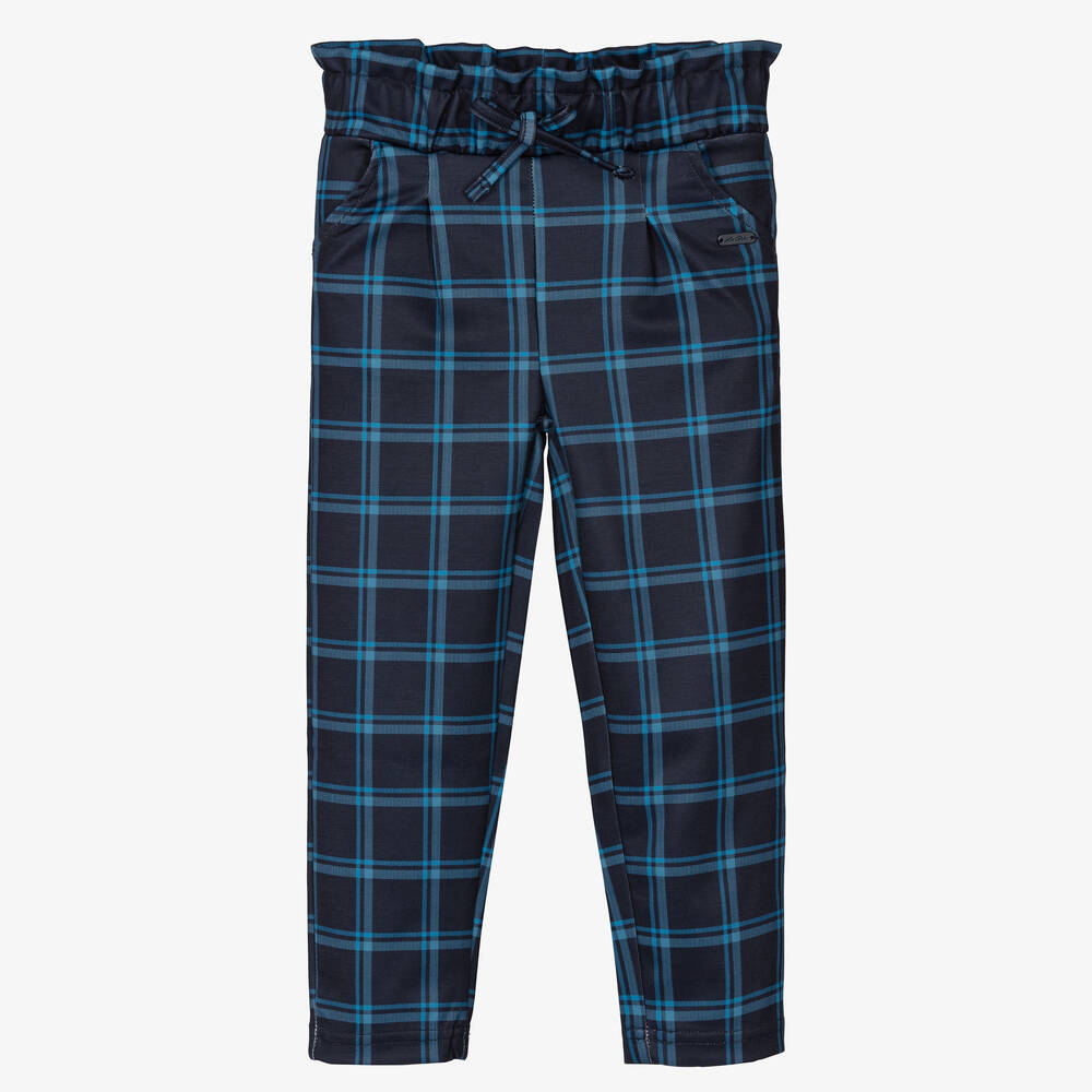 Girls navy blue trousers checked in contrasting blue by Dutch brand Le Chic, with a slim fit. Made in lightweight jersey, they have a frilled, elasticated waistband with drawstring ties. There are front pockets with a metal logo tab on one side and faux back pockets.