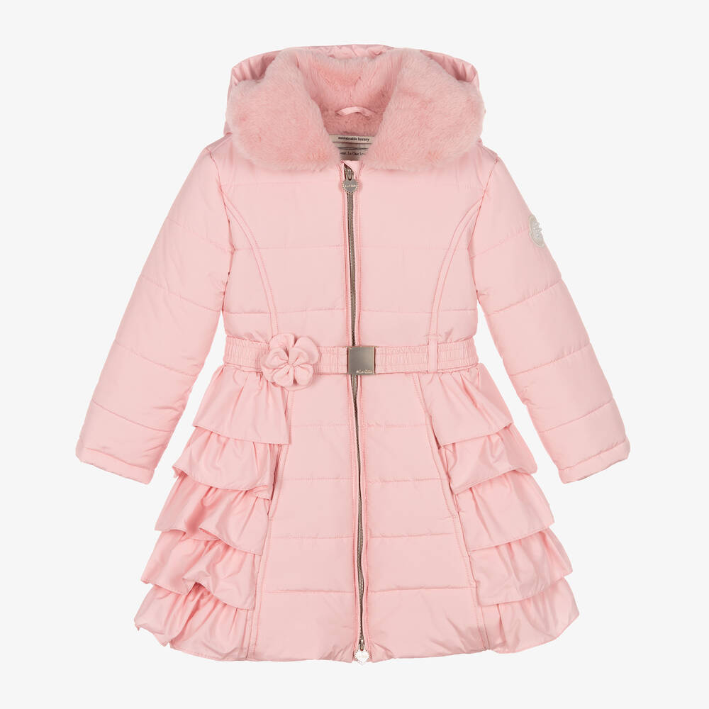 Stylish pink hooded puffer coat for girls by Le Chic, with an elasticated belt. This lovely coat is warmly padded and has a partial plush faux fur lining around the chest for added warmth. It has a large detachable hood and a faux fur covered collar. The gorgeous ruffles give it a girly look and it fastens easily with a zip at the front. It has concealed fur-lined pockets and a useful internal pocket and the brand's signature logo patch on one sleeve.
