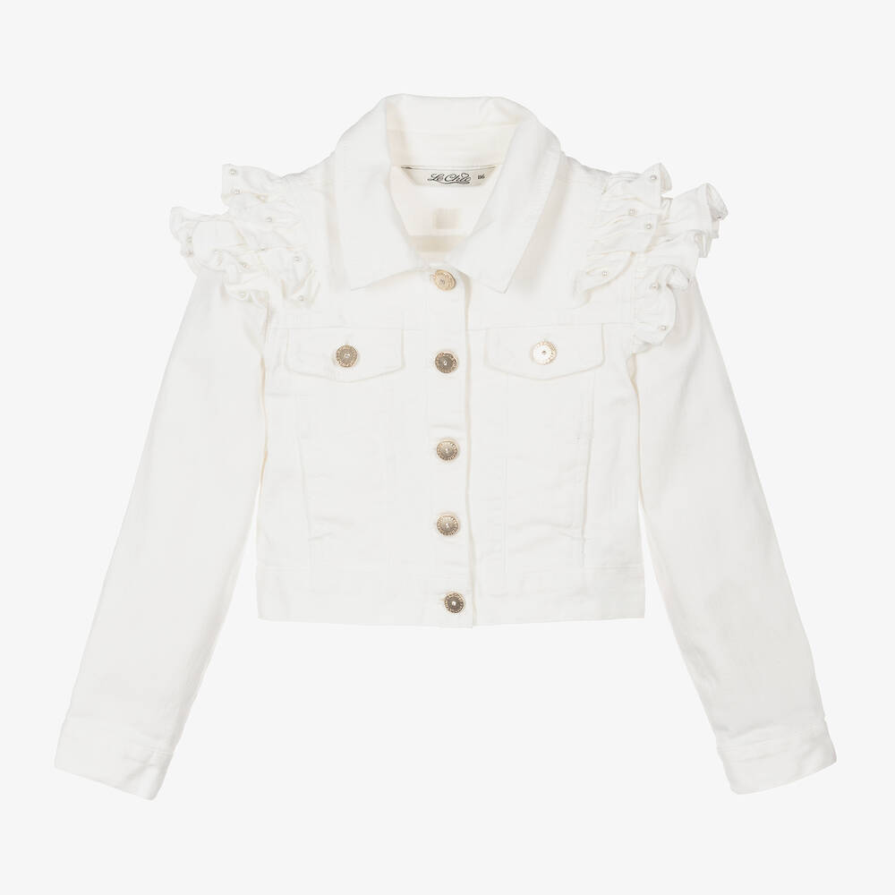 White denim jacket for girls by Le Chic, woven with a little stretch for comfort. Girly and cute, it has ruffle trims on the shoulders with shimmering faux pearls. For an added touch of sparkle, the logo-embossed, gold button fastenings each have silver diamantés. A small logo tab can be found on the back of the style, for an added designer touch.