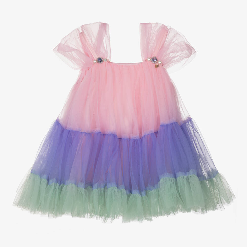Absolutely enchanting, this pink dress for girls by Le Mu is exclusive to Childrensalon. Made from lightweight tulle in a dramatic trapeze silhouette, the skirt is tiered in complementary purple and pastel green colours. The sheer short sleeves are embellished with faux pearls and crystals on the front for a touch of sparkle. Fully lined in breathable cotton, it has a smooth satin underlayer and a concealed zip fastening for a neat finish. Smaller sizes come with coordinating satin knickers.
