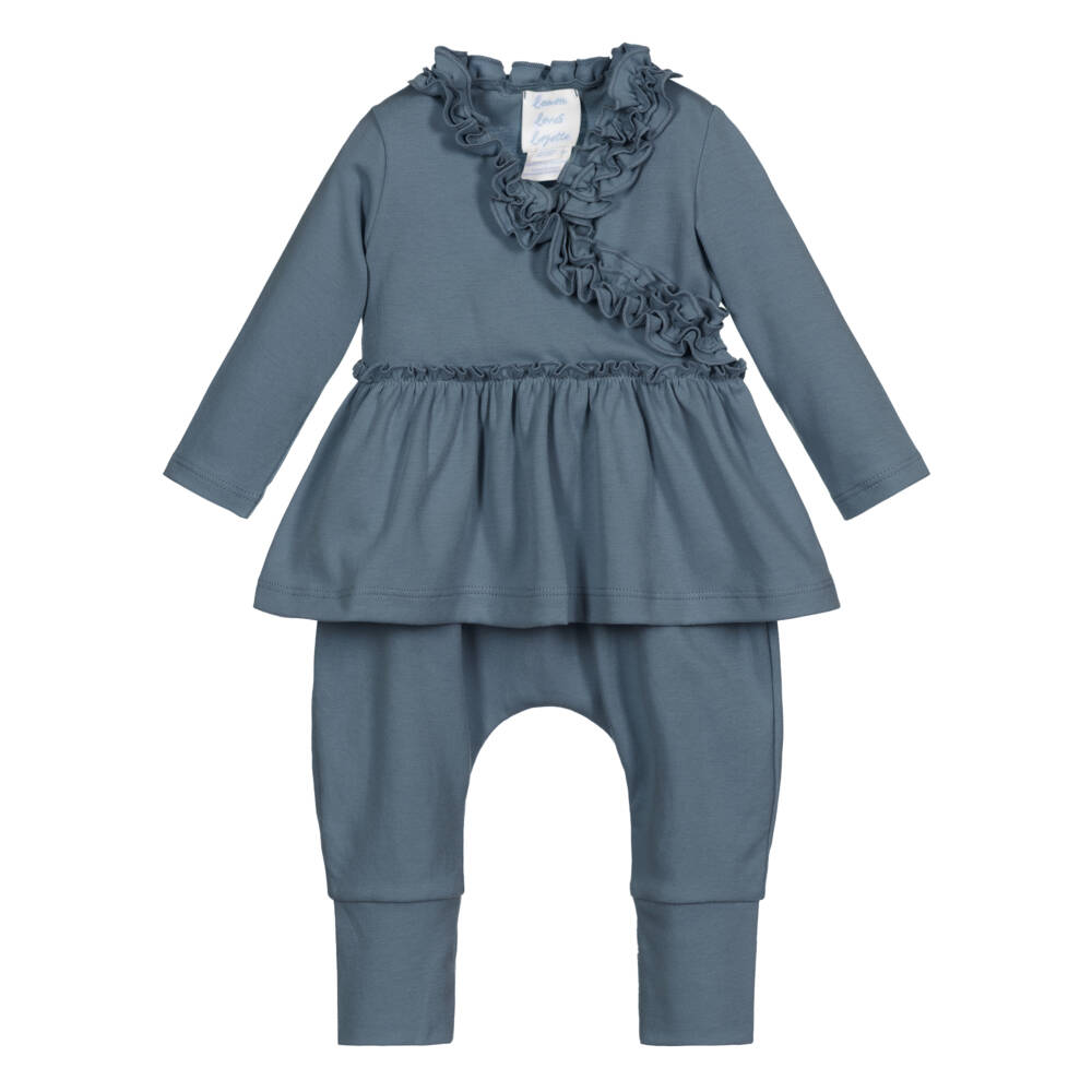 Baby girls teal blue top and trousers set by Lemon Loves Layette. It is made in super lightweight Pima cotton with a pretty ruffle on the faux wrap over front.