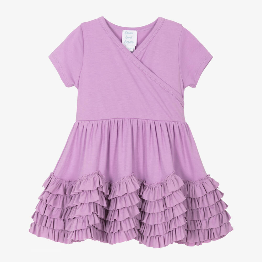 A lovely lilac purple dress for girls by Lemon Loves Layette, made in soft and lightweight Pima cotton jersey. This sweet dress pulls on easily over the head, has a cross-over bodice and a gorgeous ruffle hem.