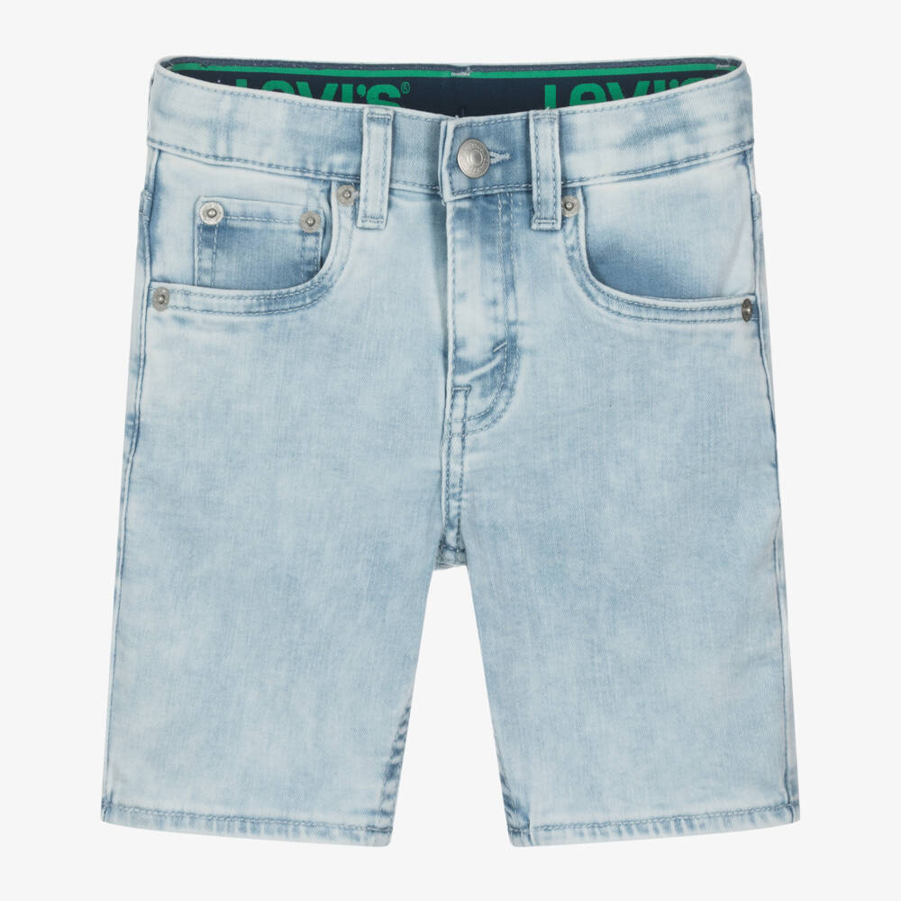 Light blue slim fit shorts for boys by Levi's, with a stone-washed look. This stretch-denim style is made using REPREVE materials sourced from recycled plastic bottles, have TruTemp 365 thermo-regulating technology, and contain LENZING EcoVero viscose. Detailed with tonal stitching and branded studs, these shorts feature the iconic 2-Horse jacron patch on the back of the waist and have a Red Tab logo stitched on one back pocket for a signature designer finish. They fasten with a hook and zip on smaller sizes and a button and zip on larger sizes, along with an adjustable waistband for a great fit.
