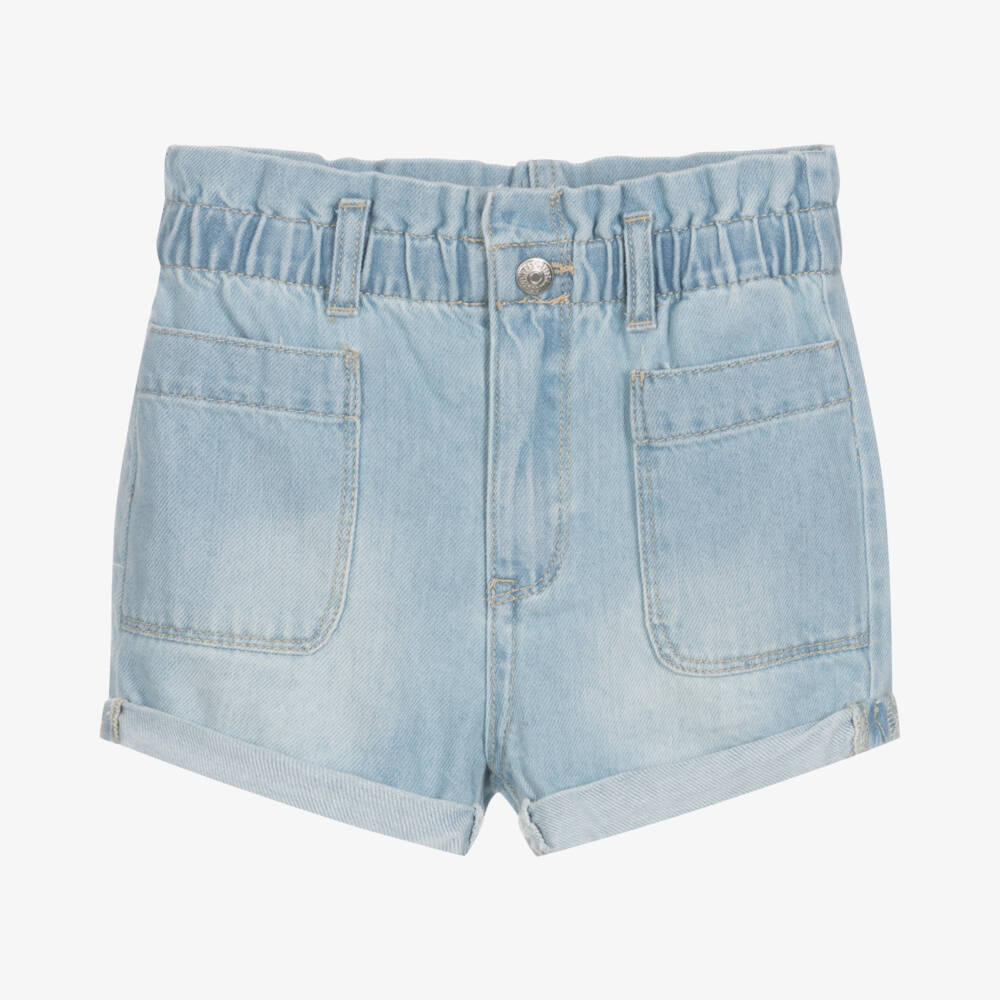 Blue light wash denim shorts for girls by American brand Levi's. In a flattering high-rise fit, these soft cotton denim shorts have pockets on both the front and back, hook and zip fastening and an elasticated waist for a comfortable fit. The iconic red tab logo is on the back pocket for an extra branded touch.