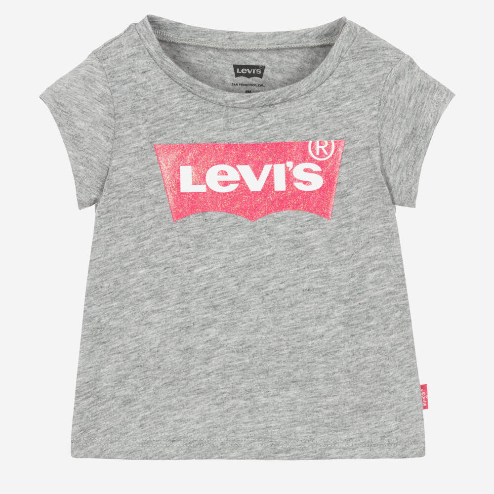 Grey marl T-shirt for younger girls by Levi's. Made in soft cotton jersey, this casual crew neck has capped sleeves and the brand's iconic Batwing logo printed on the front in glittery pink. The brand's iconic Red Tab can be found on the side seam for a subtle designer touch. There are popper fastenings on one shoulder on the smaller sizes for quick, fuss-free dressing.