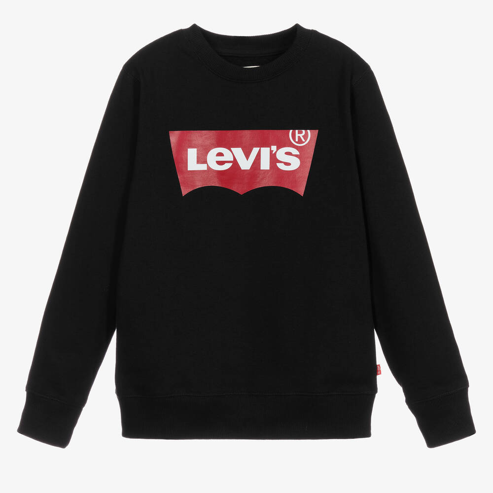 Cosy black sweatshirt for teen girls and boys by Levi's. It is made in comfortable mid-weight jersey with a warm fleecy inside. For instant brand recognition, it has the designer's iconic Batwing logo on the front in red and white.