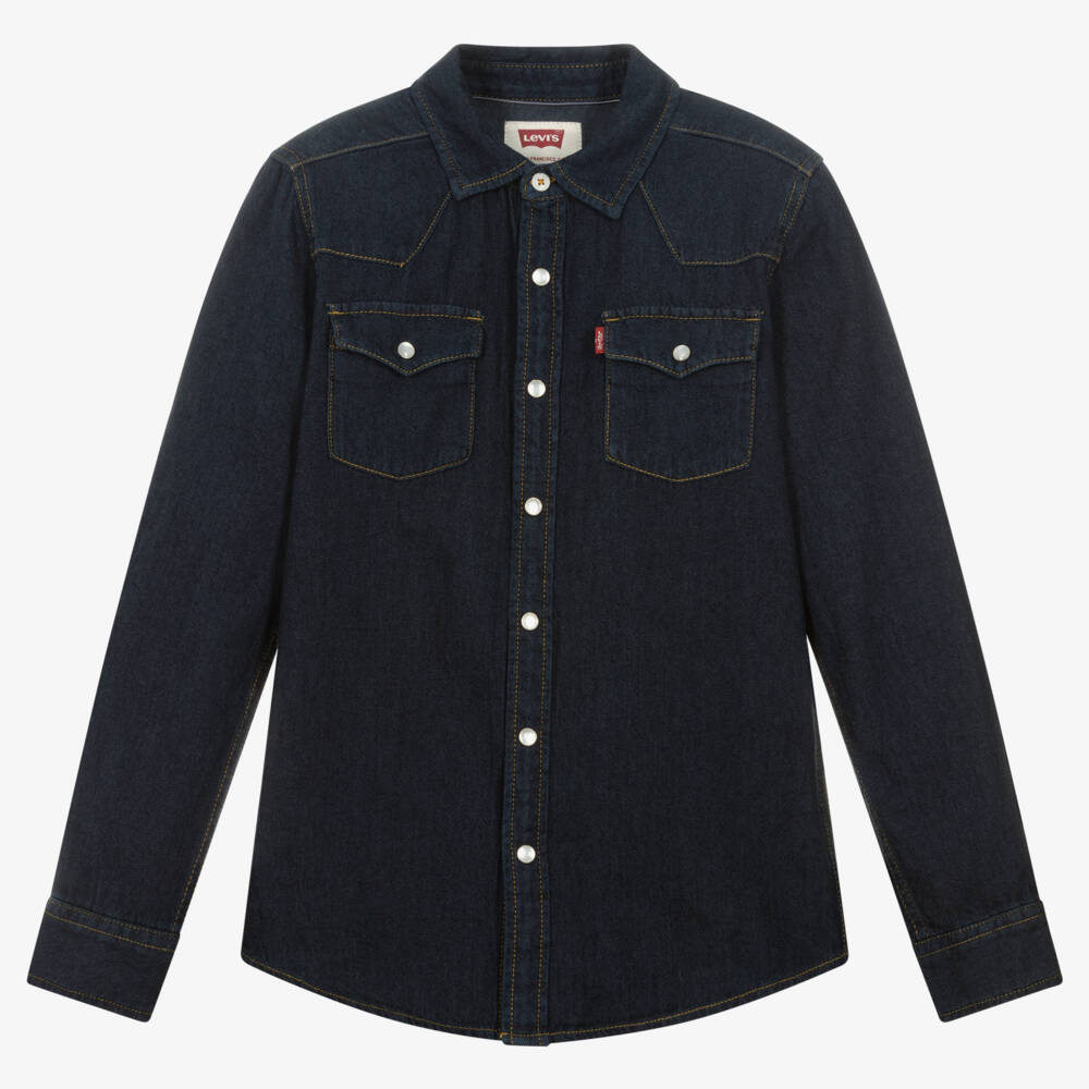 Great for casual styling, this dark blue denim shirt for teen boys is from Levi's. It features the brand's iconic red logo tab on the popper-fastening chest pocket, with a branded canvas patch in the placket. There are pearlescent popper fastenings on the front.