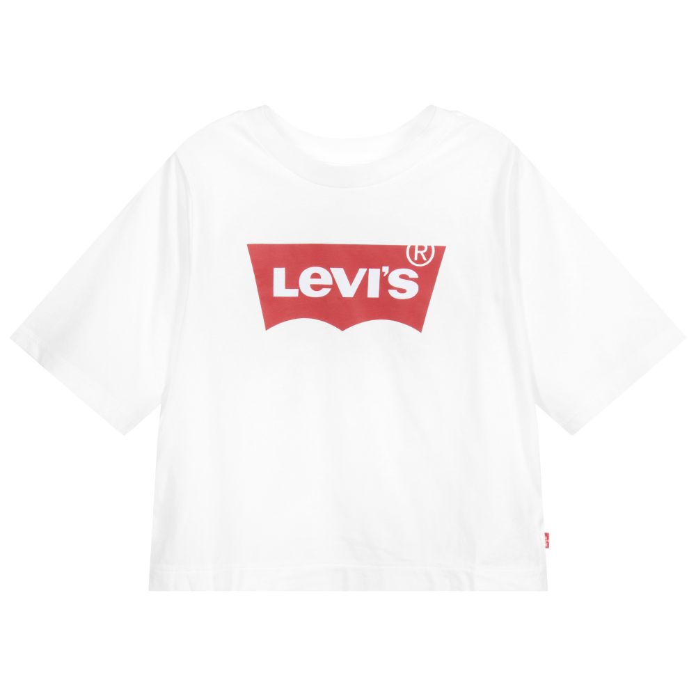 A Levi's classic, this white T-shirt has a red Batwing logo print. A modern style for teen girls, this white cotton top is cropped and loose fitting.